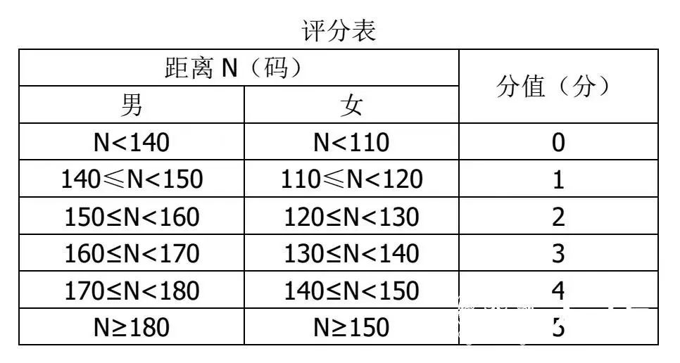 被测试者在指定区域内击球,设置50码处宽度为20码、150码处宽度为40码的有效区域边界线。球停点距离大于180(140)码且在有效区域内即可得分,每名被测试者有5次击球机会。每次得分击球的分值根据下表换算,5次击球的总得分X2/5即为该科目得分。