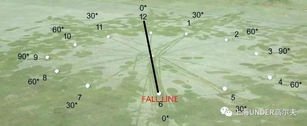 果岭一边高一边低,自然就会产生高度,最高的地方是12点,最低的地方是6点,两个点之间的直线称为垂直线,在推杆过程中,6点到12点的连线即为直线,在这条线上不会产生任何的拐弯。